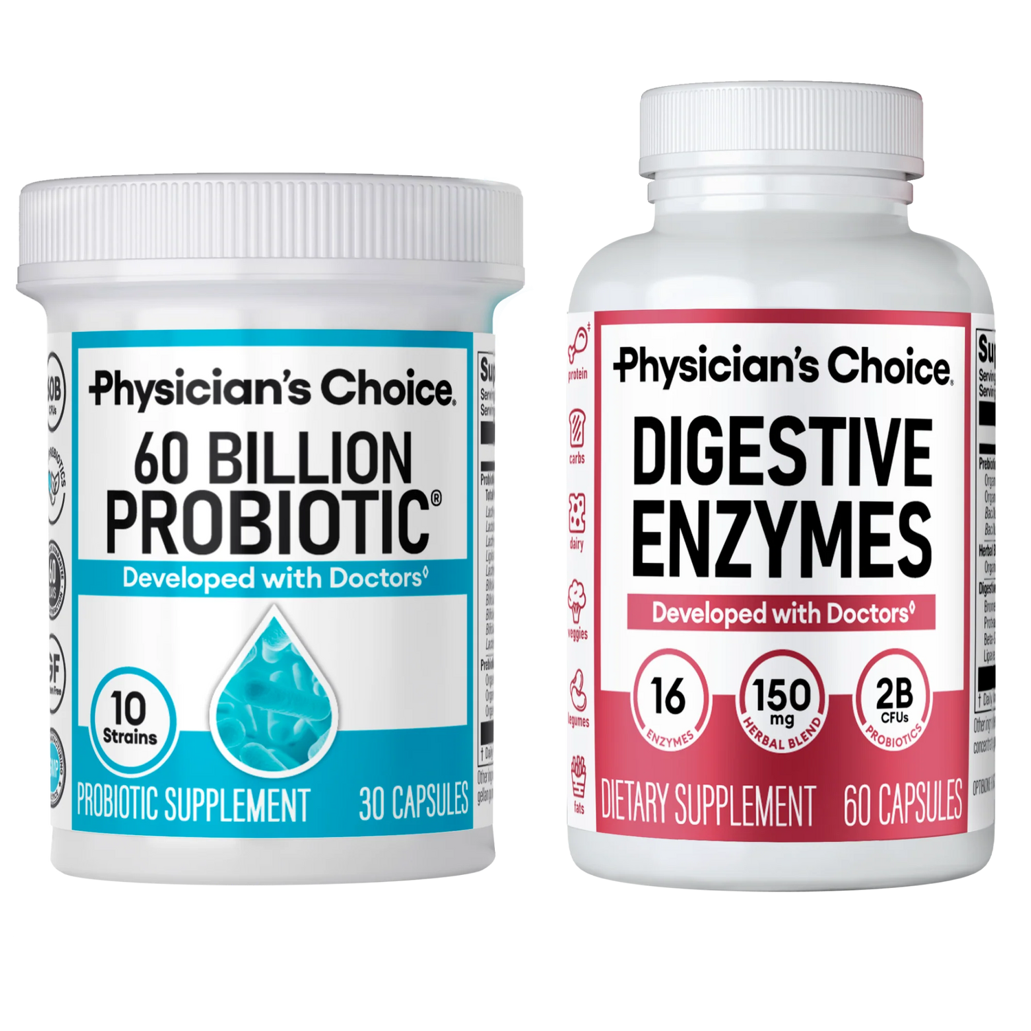 A complete daily gut health solution combining 60 Billion Probiotics + Digestive Enzymes to support digestion, nutrient absorption, and immune health.